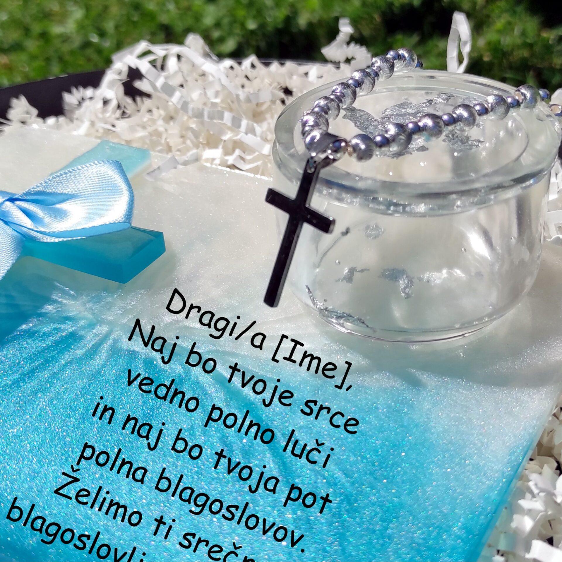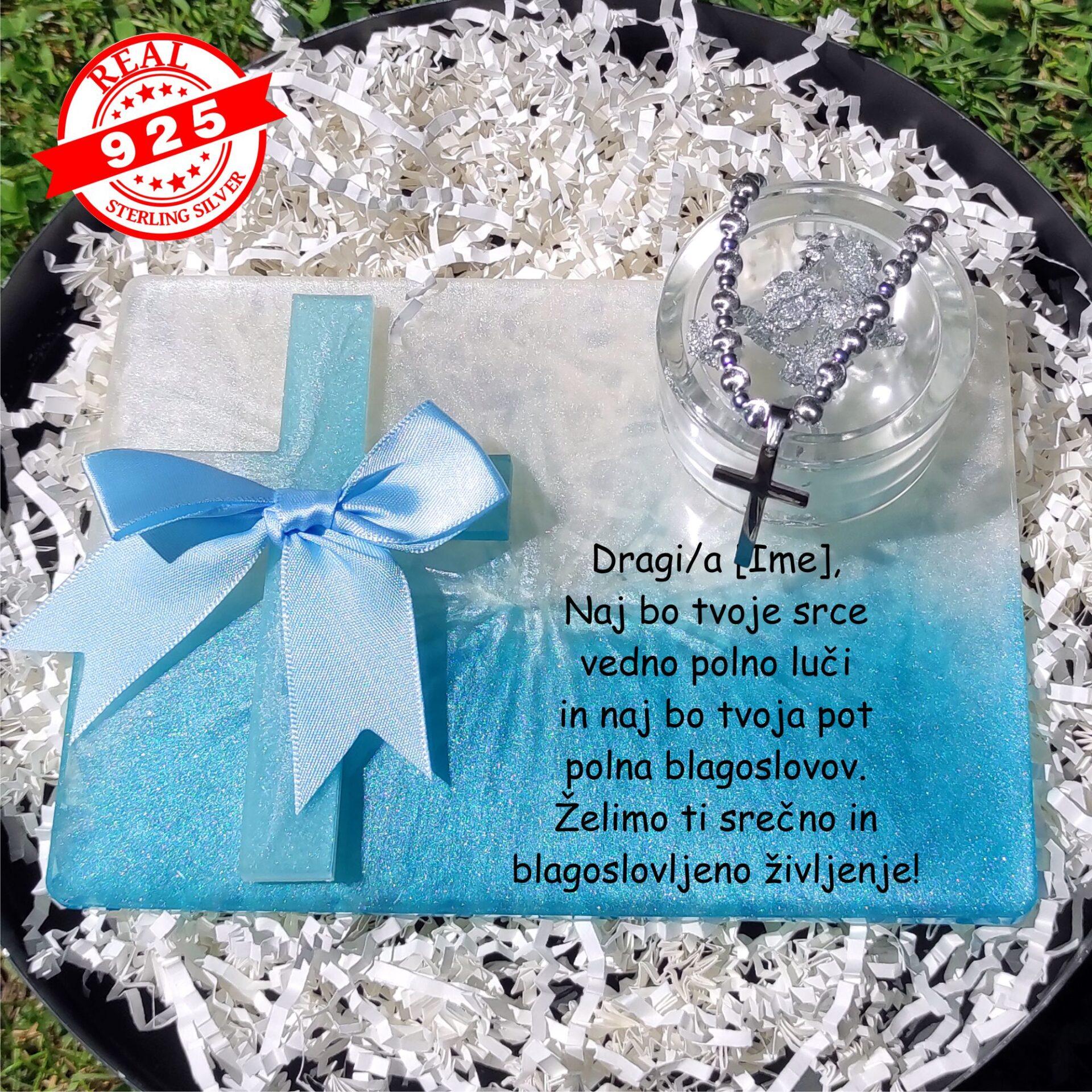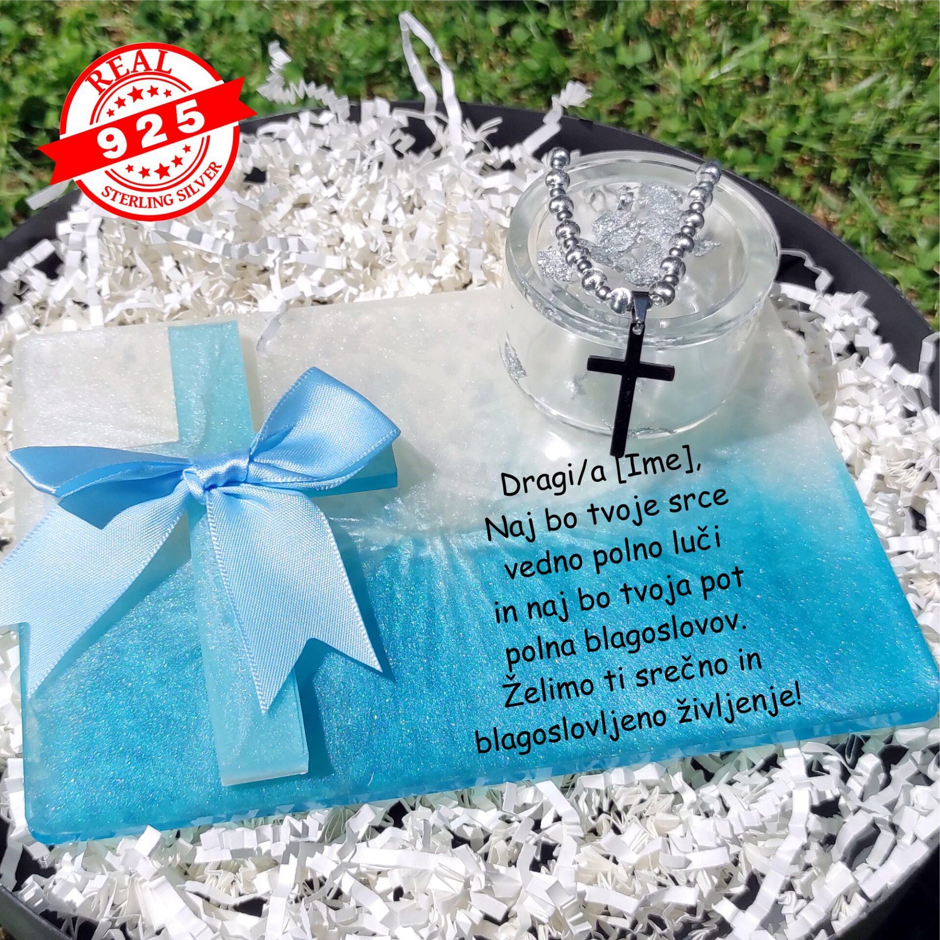 - Na ploščici je pritrjen ročno izdelan križ iz epoksi smole v modro-beli barvi z nežno mašljo.