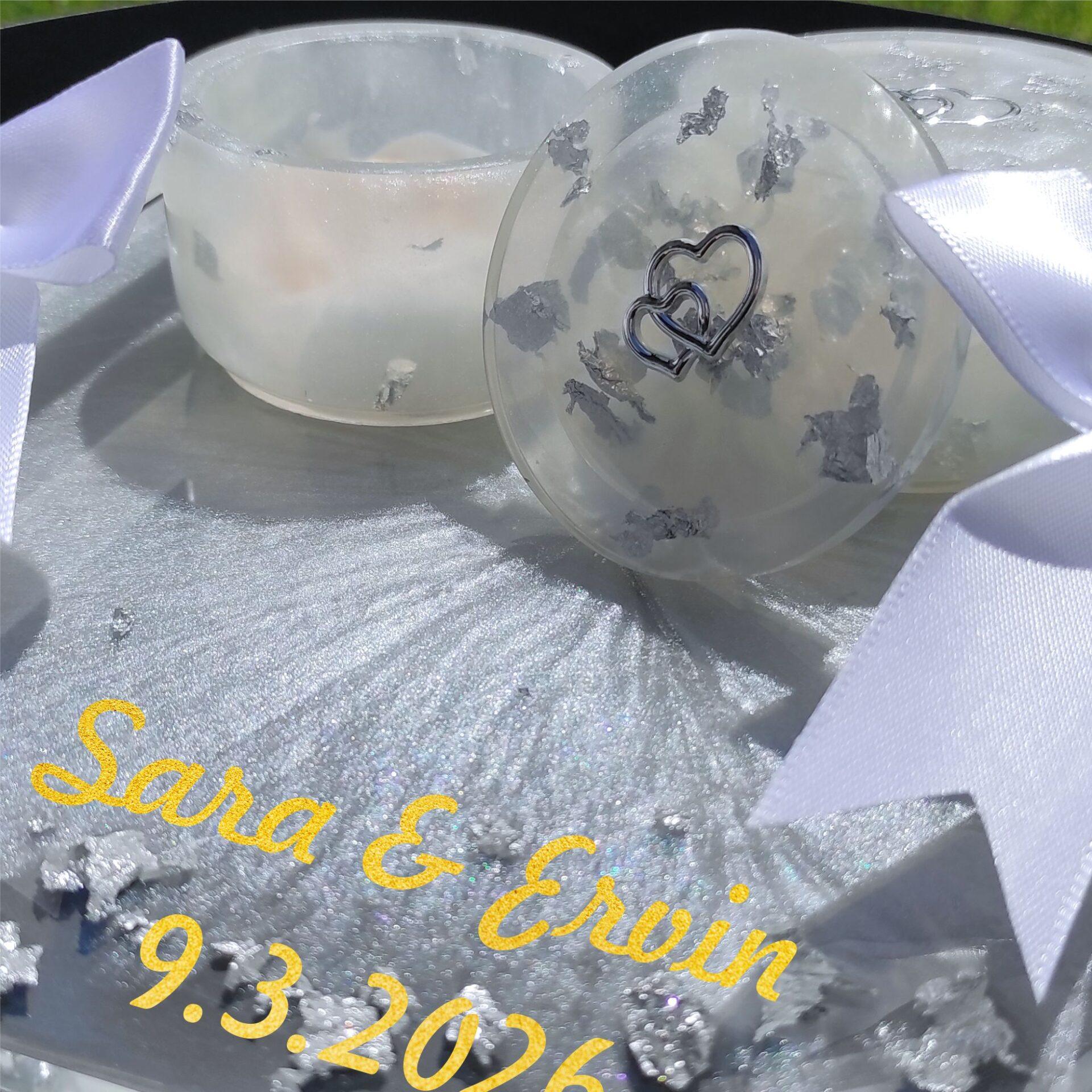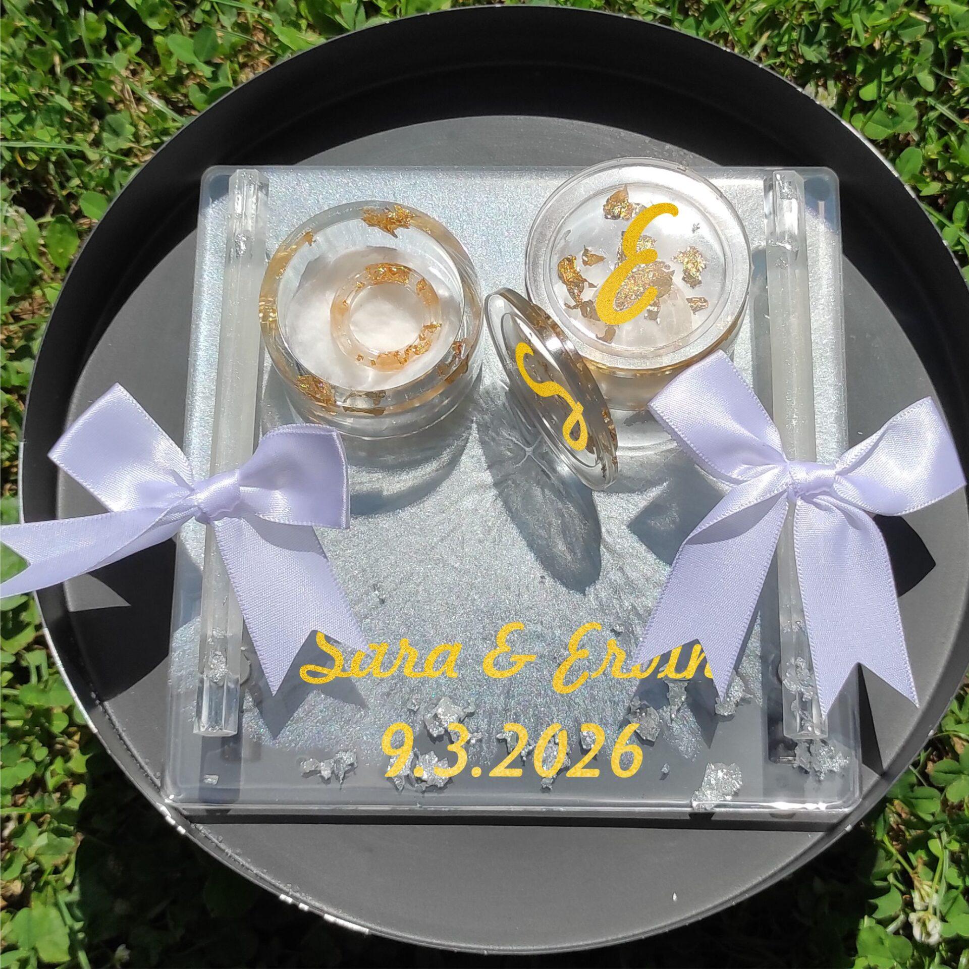 Ta pladenj in škatlici, skrbno izdelani iz premium epoksi smole v nebežnem svilnatem odtenku, predstavljata vrhunec poročne elegance. Set vključuje:
