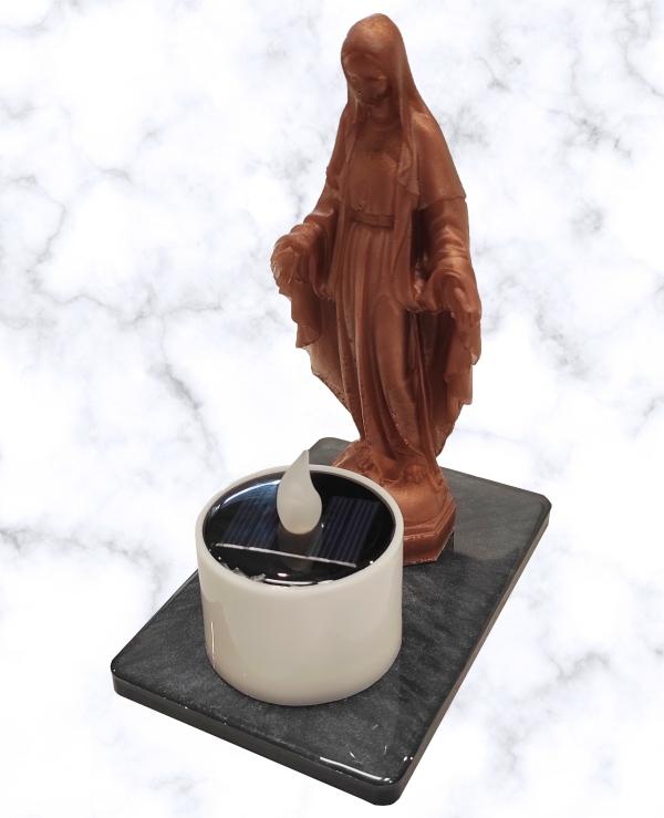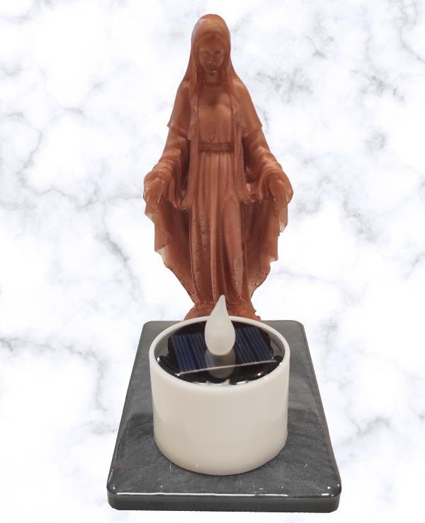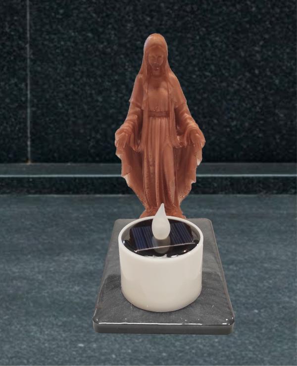 Izrazite globoko vero in trajen spomin z našo edinstveno nagrobno dekoracijo. Ročno izdelan svečnik z Marijinim kipom iz trpežne epoksi smole je osrednji element, namenjen solarni svečki, ki prinaša večno svetlobo. Marijin kip simbolizira vero in upanje. Ta edinstvena dekoracija združuje estetsko dovršenost in globoko simboliko, kar jo naredi popolno za izražanje trajnega spomina na vaše najdražje. Vsak detajl je ročno izdelan z ljubeznijo, da bo vaš spomin ostal večno živ. Zaradi ročne izdelave lahko pride do rahlih razlik v barvnih odtenkih, teksturi ali detajlih med posameznimi izdelki, kar daje vsakemu izdelku poseben čar in individualnost.