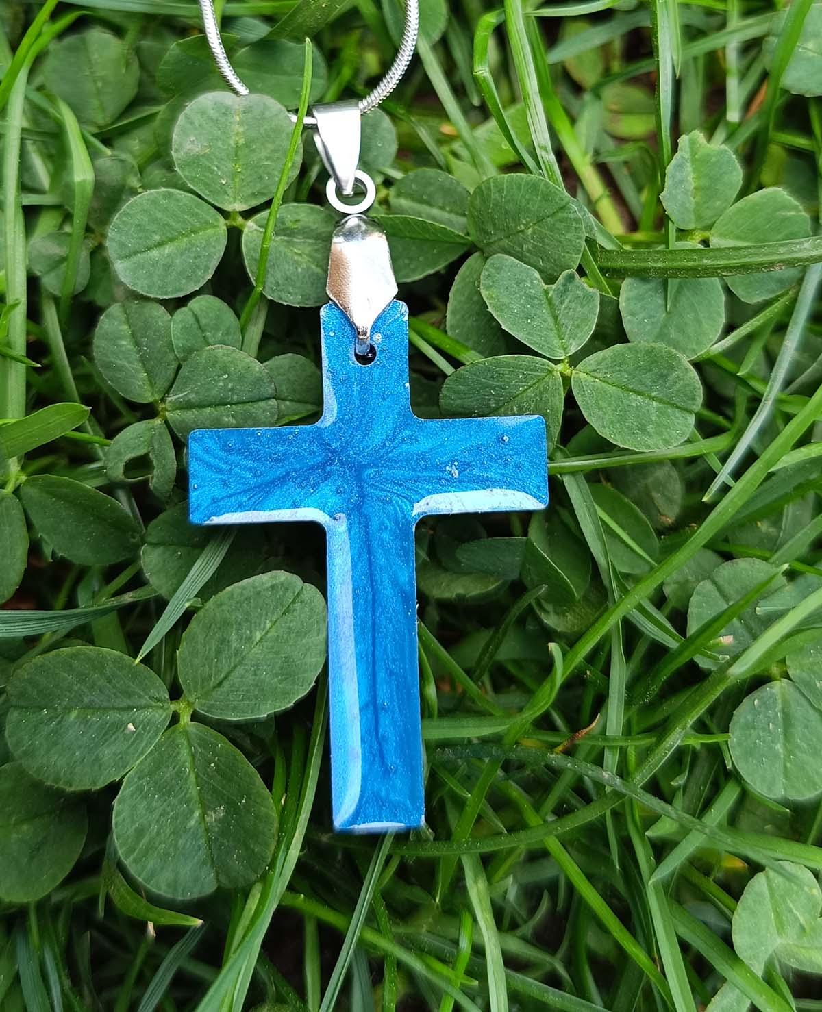 Modri sijaj – elegantna srebrna verižica z modrim križem iz epoksi smole