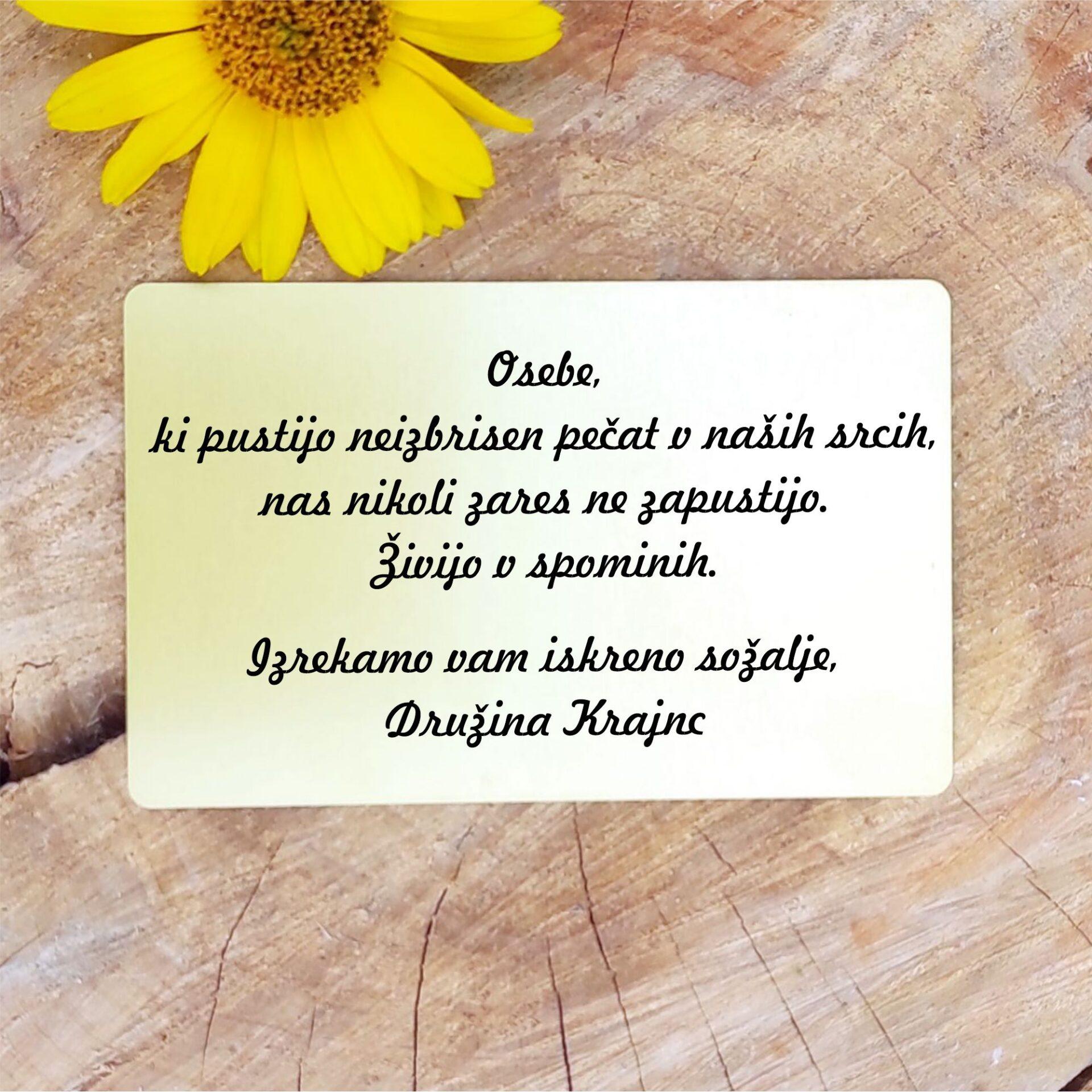 - Personalizirano sožalno posvetilo: Priložena je aluminijasta ploščica z žalnim posvetilom. Izberete lahko posvetilo iz naše predloge ali napišete lastno osebno sporočilo, ki darilu doda globok, osebni pridih.Celoten set je pakiran v črni kartonski škatli s črno pentljo.