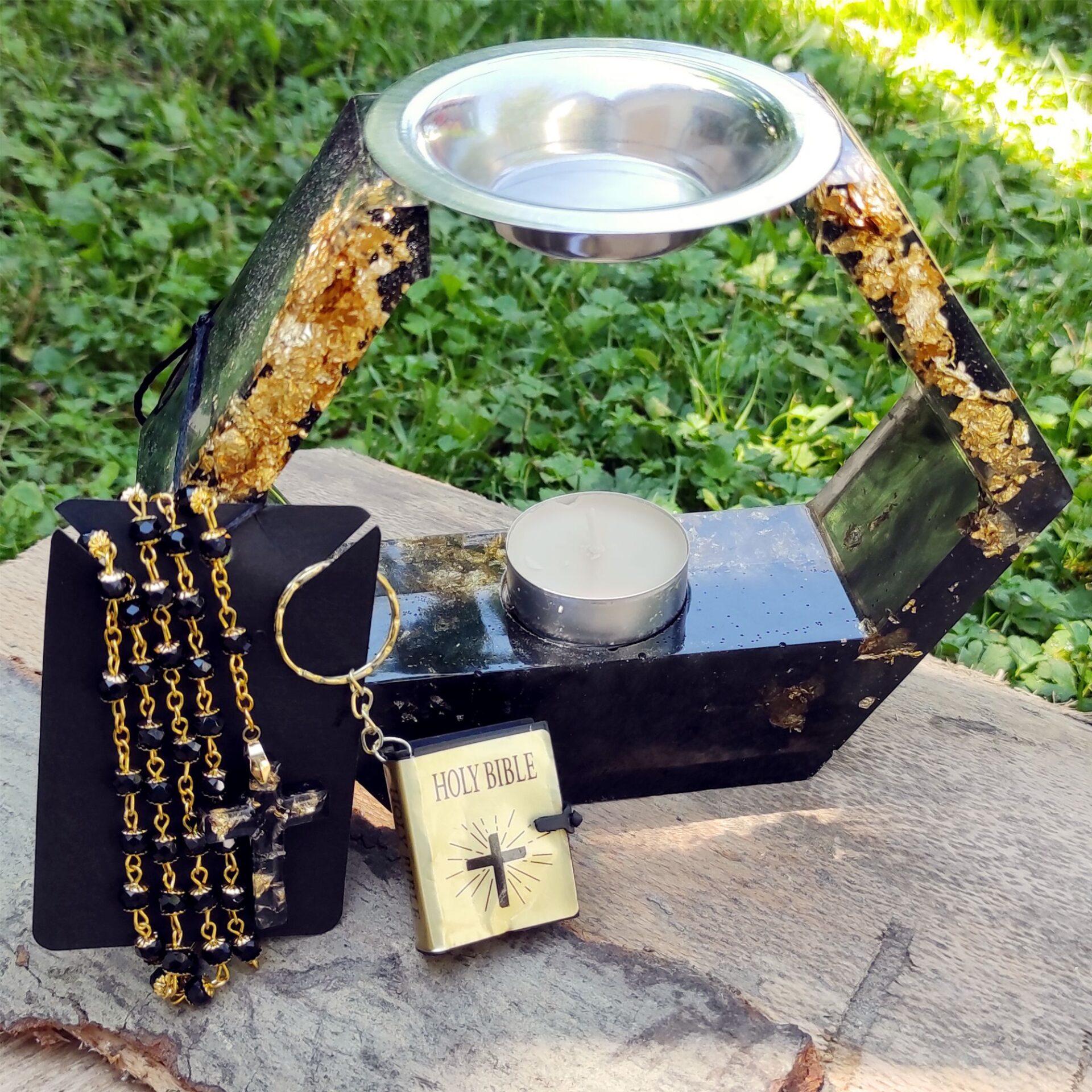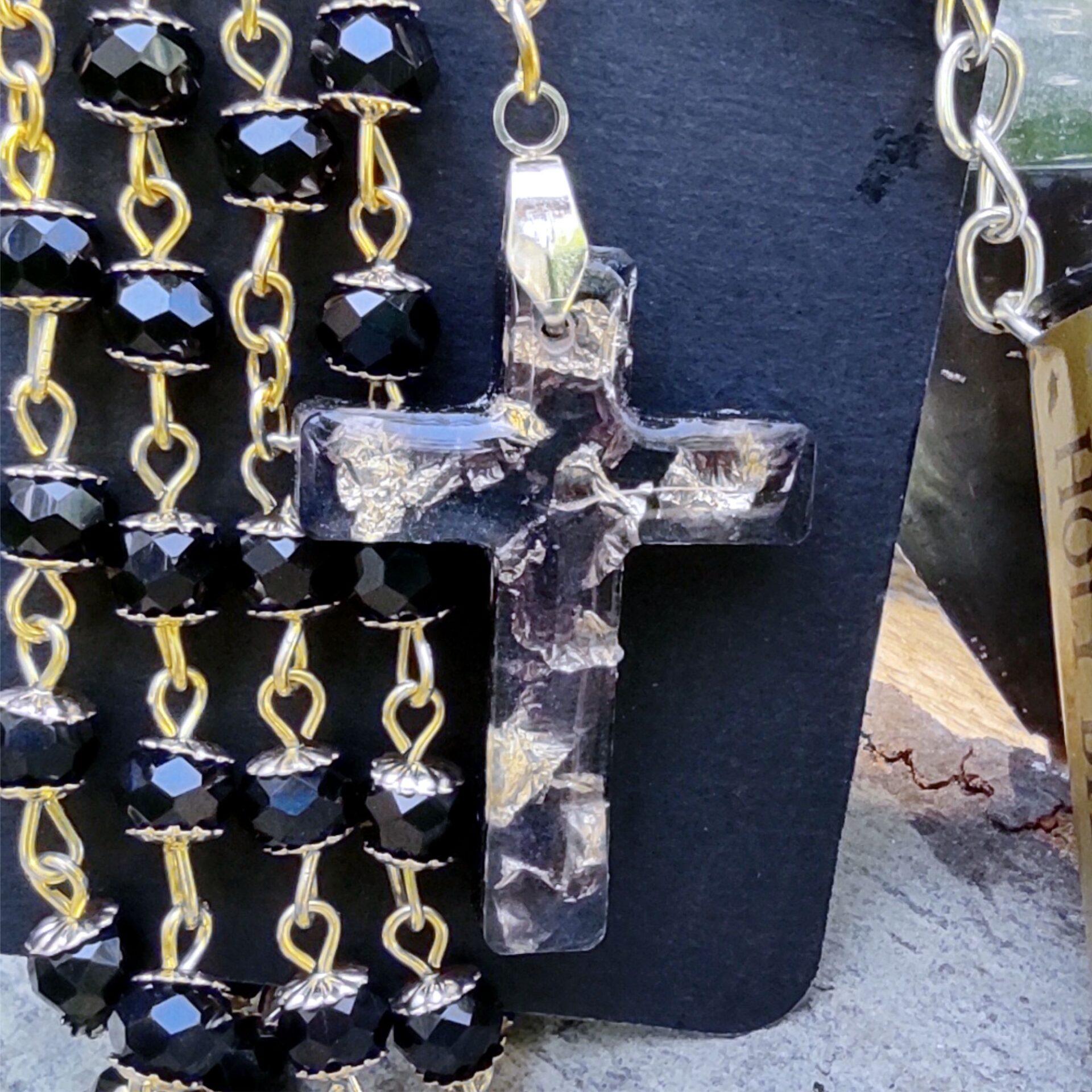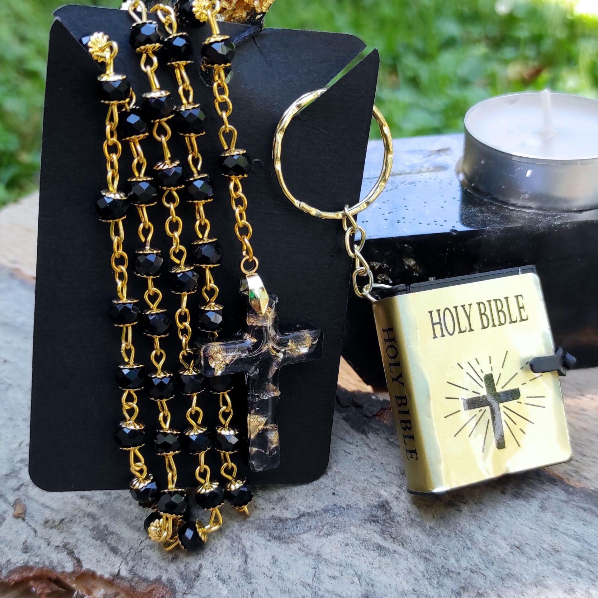 - Priložen je rožni venec (črno-zlati) z unikatnim križem, ročno izdelanim iz UV epoksi smole (z zlatimi lističi).