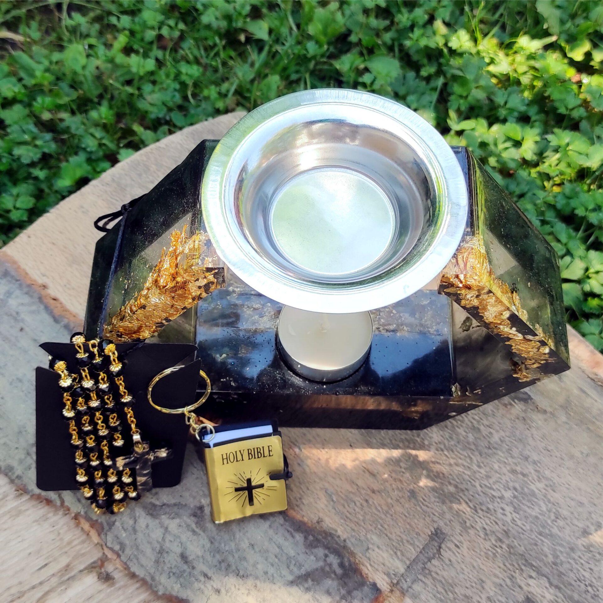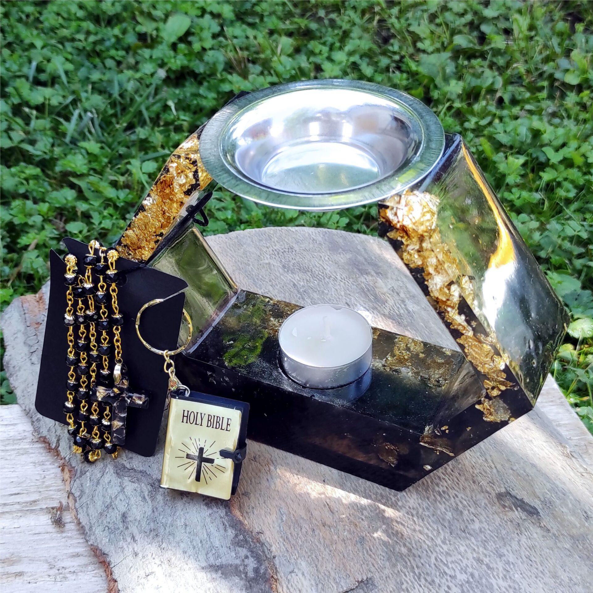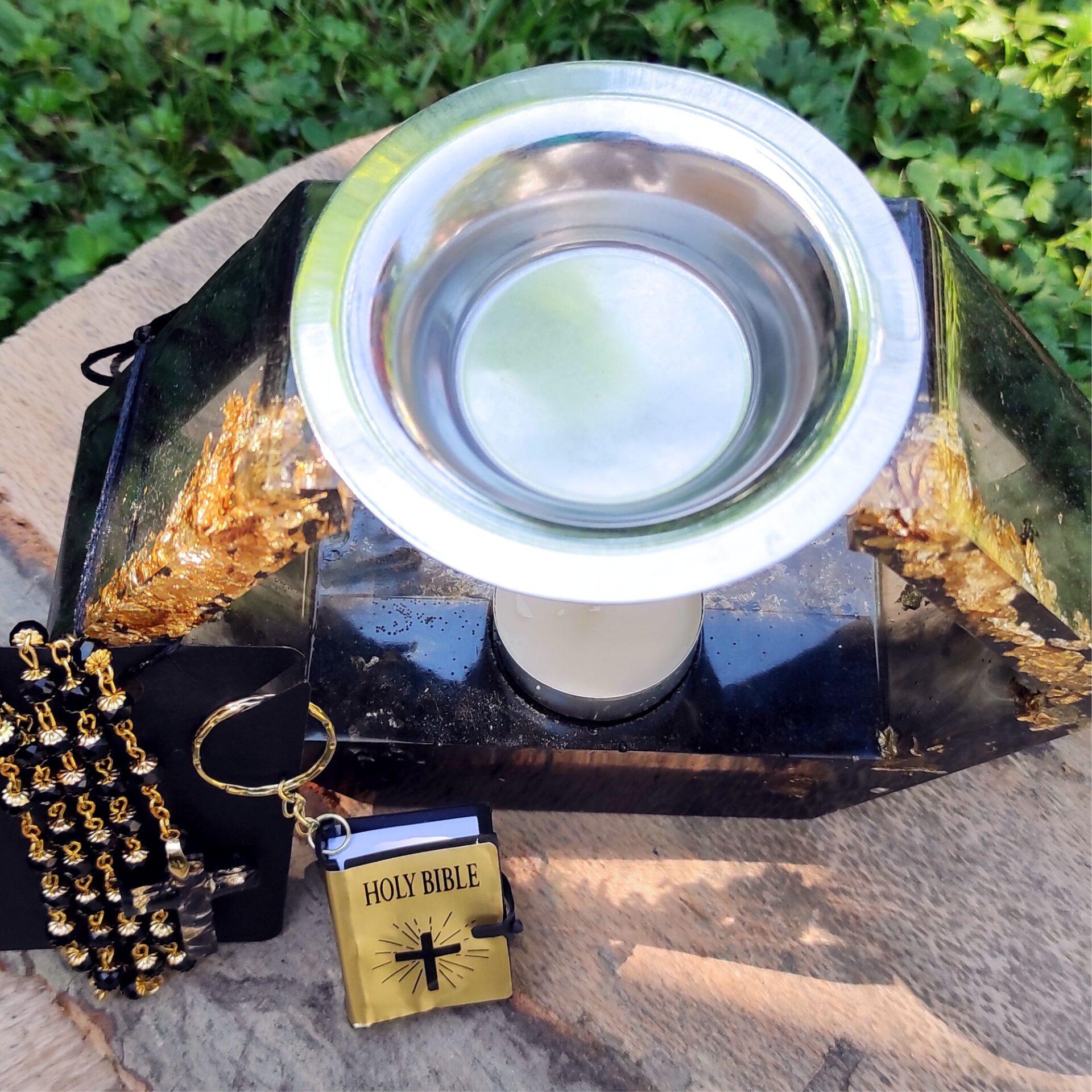 - Priložen je rožni venec (črno-zlati) z unikatnim križem, ročno izdelanim iz UV epoksi smole (z zlatimi lističi).