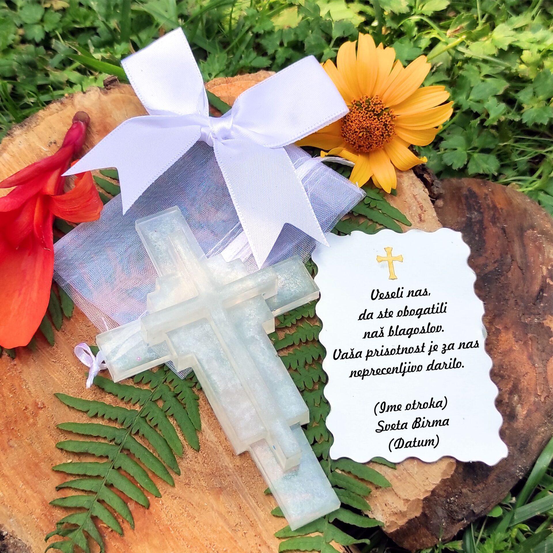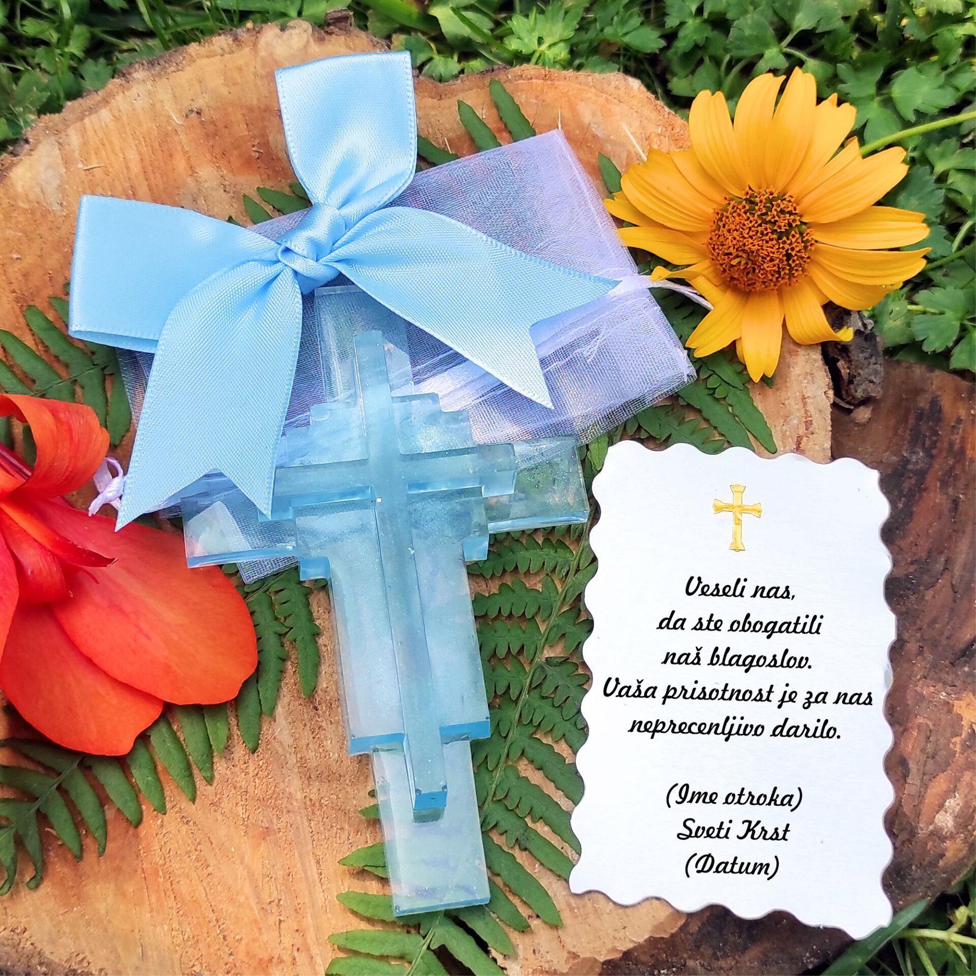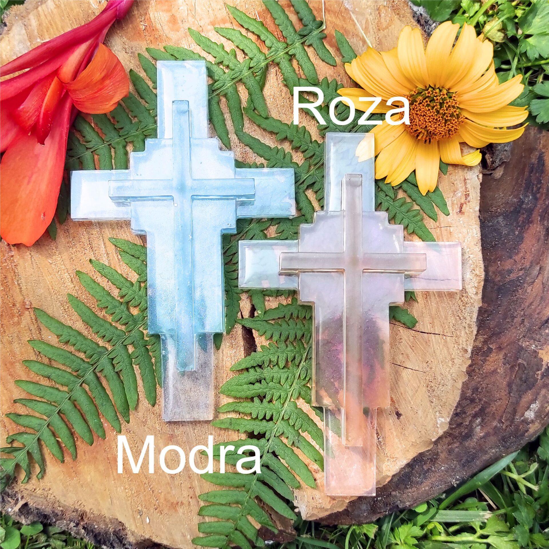 - Križ iz smole: Ročno izdelan križ z modernim, večnivojskim dizajnom. Na voljo je v treh čudovitih pastelnih odtenkih: svetlo modra, svetlo roza in svilnata (biserna) bela. Svilnata različica je še posebej elegantna in primerna za vse priložnosti.