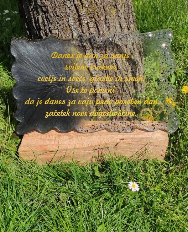 Epoksi izdelki so znani po svoji trdnosti, odpornosti in možnosti ustvarjanja edinstvenih oblik in barvnih prelivov. Ta personalizirana poročna dekoracija bo tako postal dragocen spomin na vajin ljubezenski začetek.