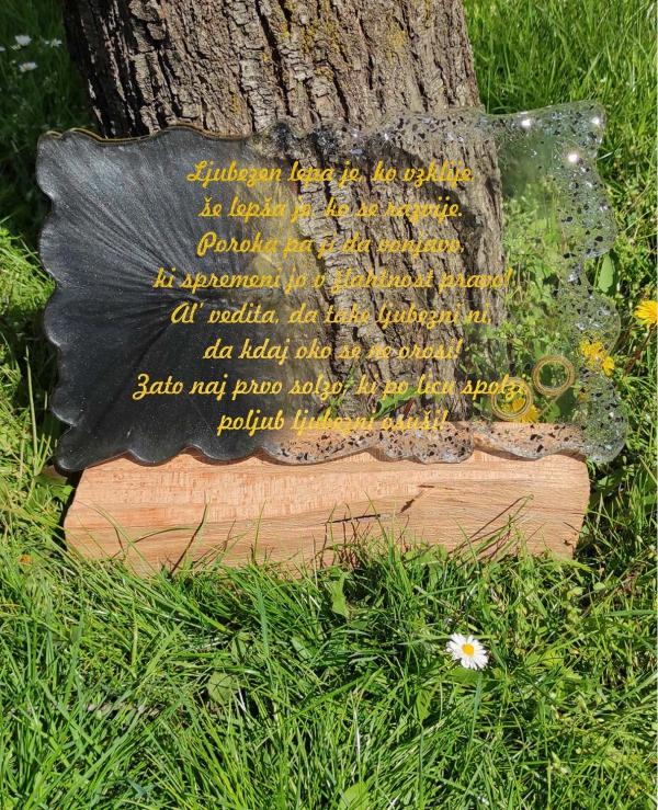 Epoksi izdelki so znani po svoji trdnosti, odpornosti in možnosti ustvarjanja edinstvenih oblik in barvnih prelivov. Ta personalizirana poročna dekoracija bo tako postal dragocen spomin na vajin ljubezenski začetek.