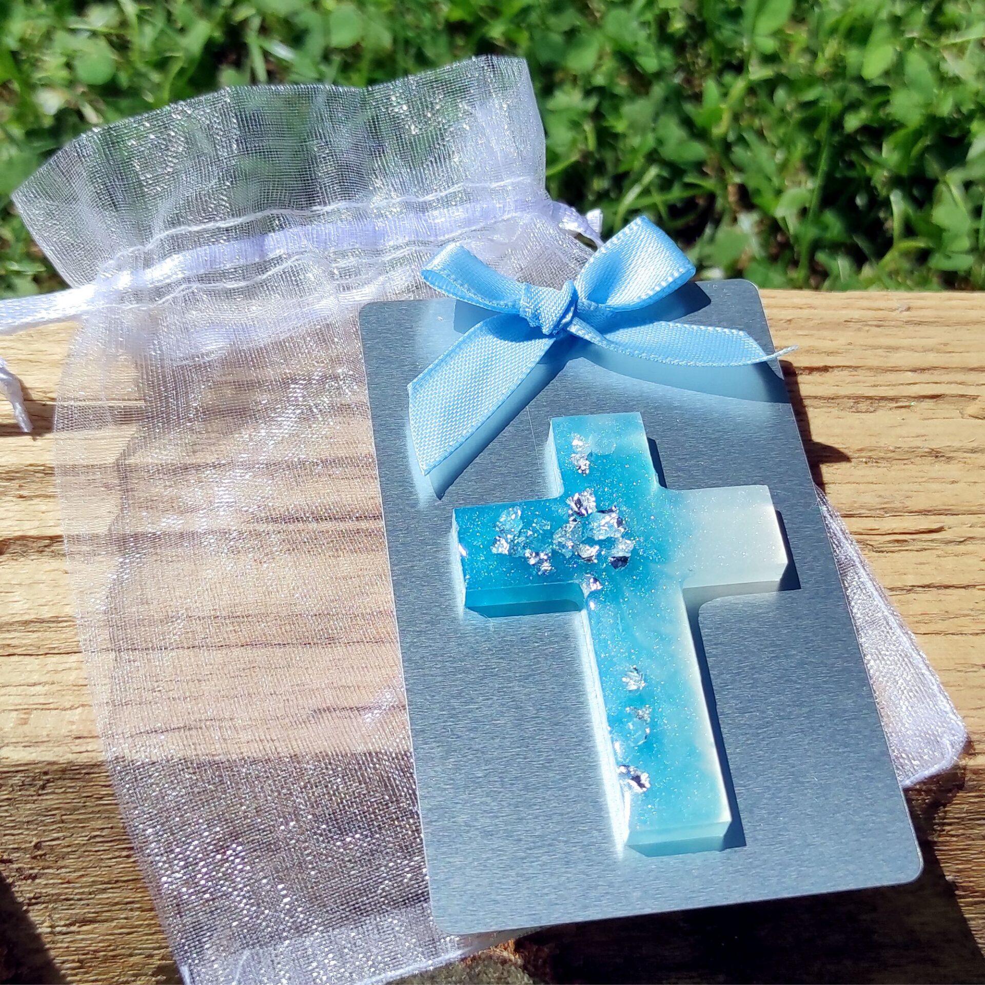 Da bi se darilo popolnoma ujemalo s tematiko krsta, lahko izbirate med tremi barvnimi možnostmi za križ (iz smole) in mašljo: