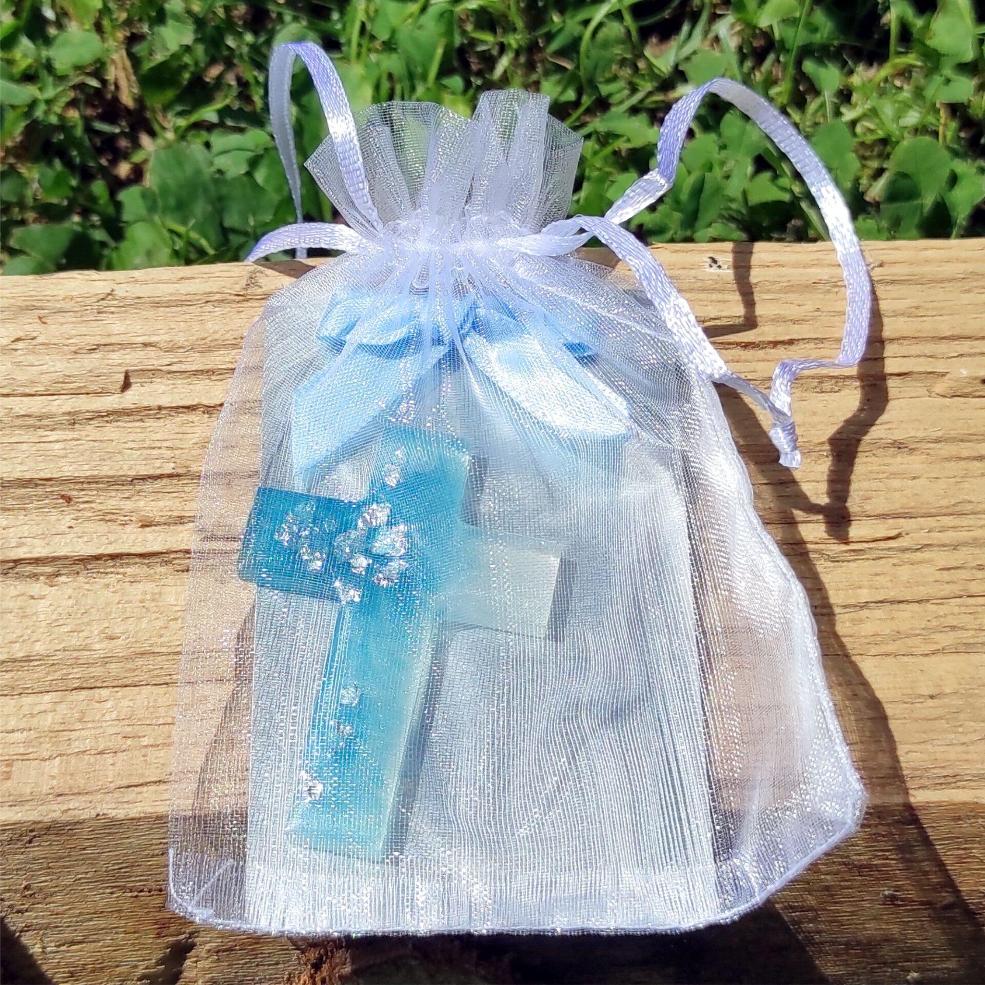 - Celoten komplet je elegantno zapakiran v prosojno belo vrečko iz blaga (organza), pripravljeno za daritev.