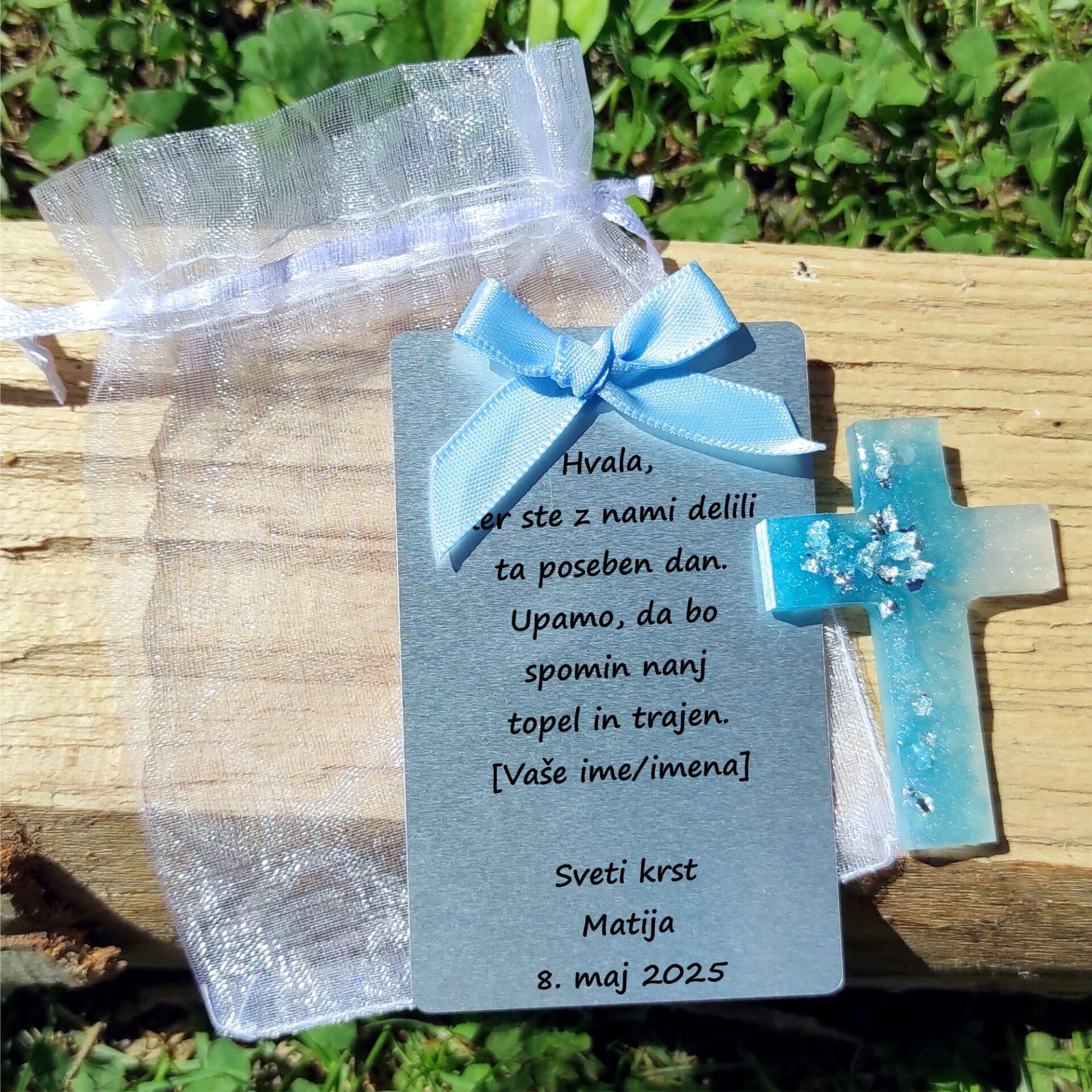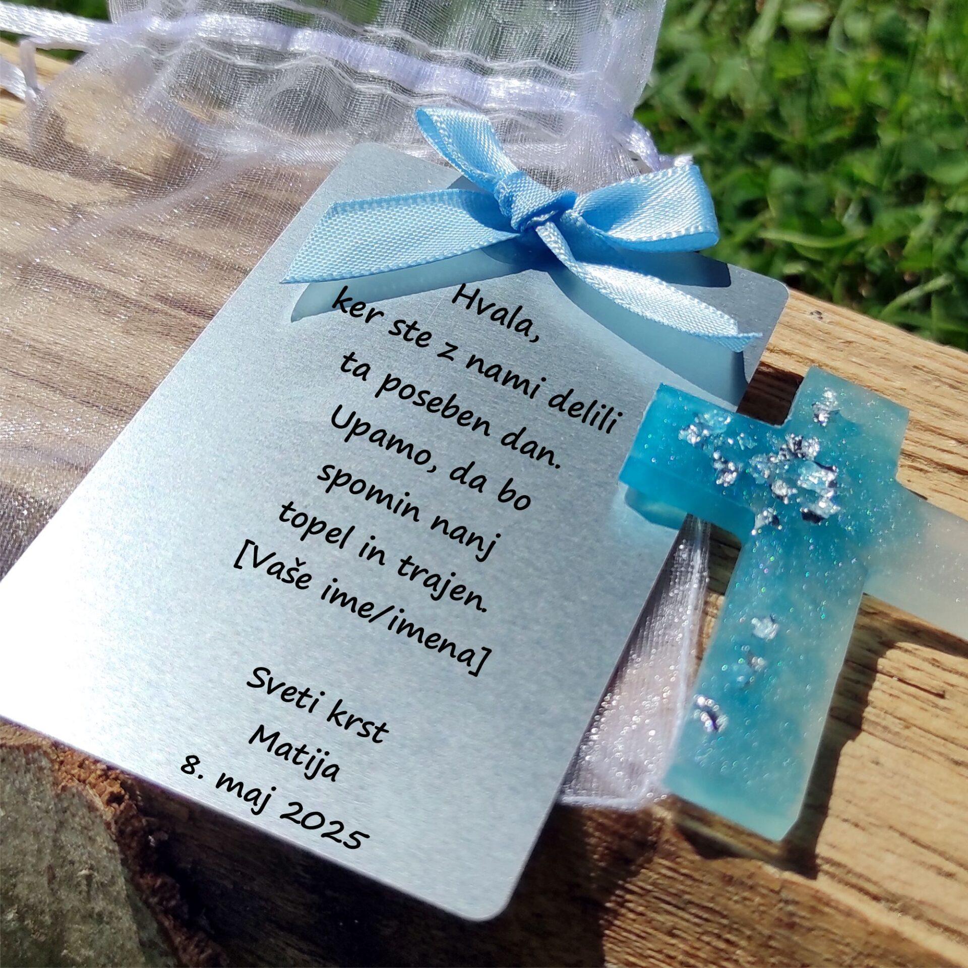- Elegantna aluminijasta ploščica na katero je natisnjeno osebno zahvalno sporočilo in podatki o krstu.