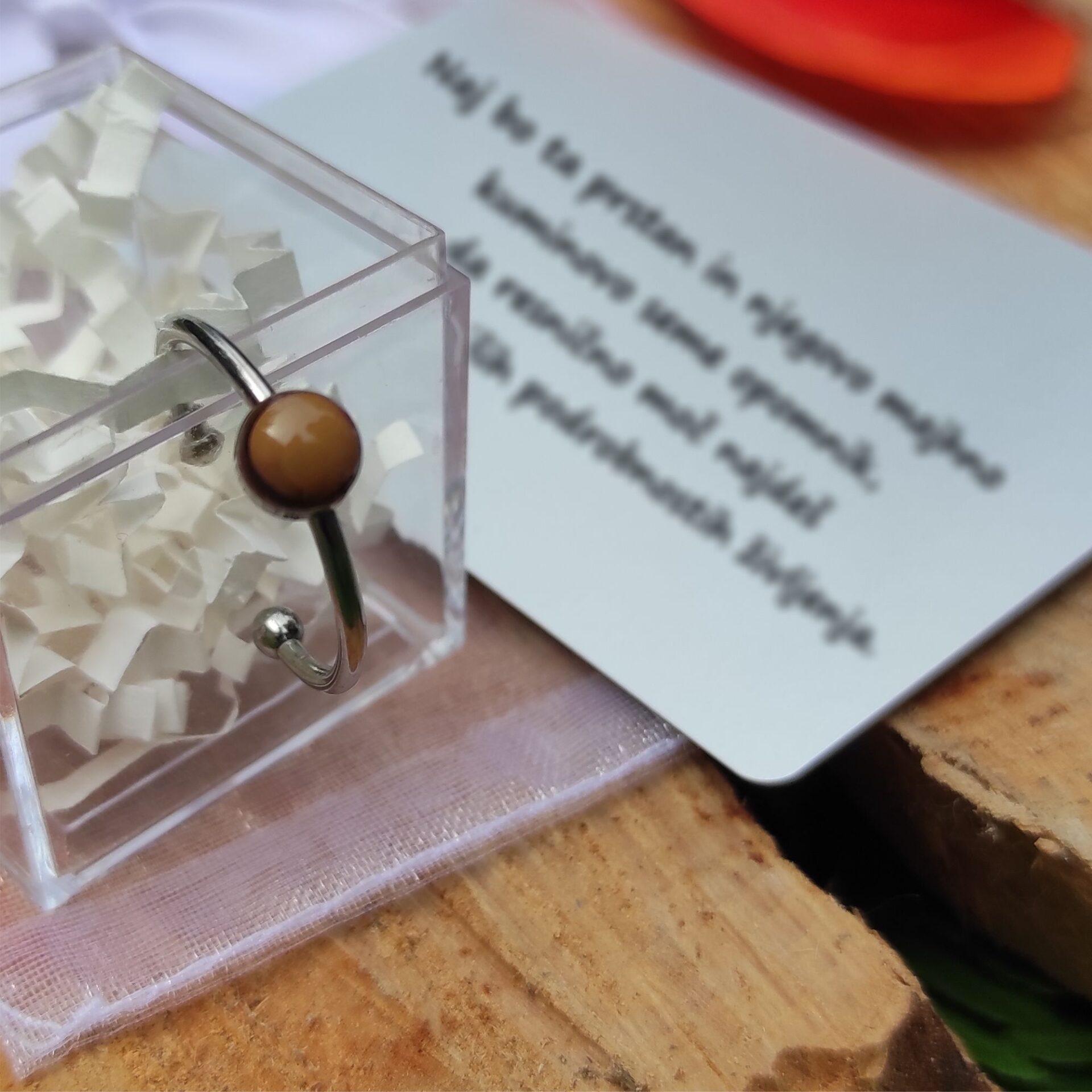 - Darilna embalaža: Prstan je zapakiran v elegantno, prozorno škatlico, pripravljeno za obdarovanje.