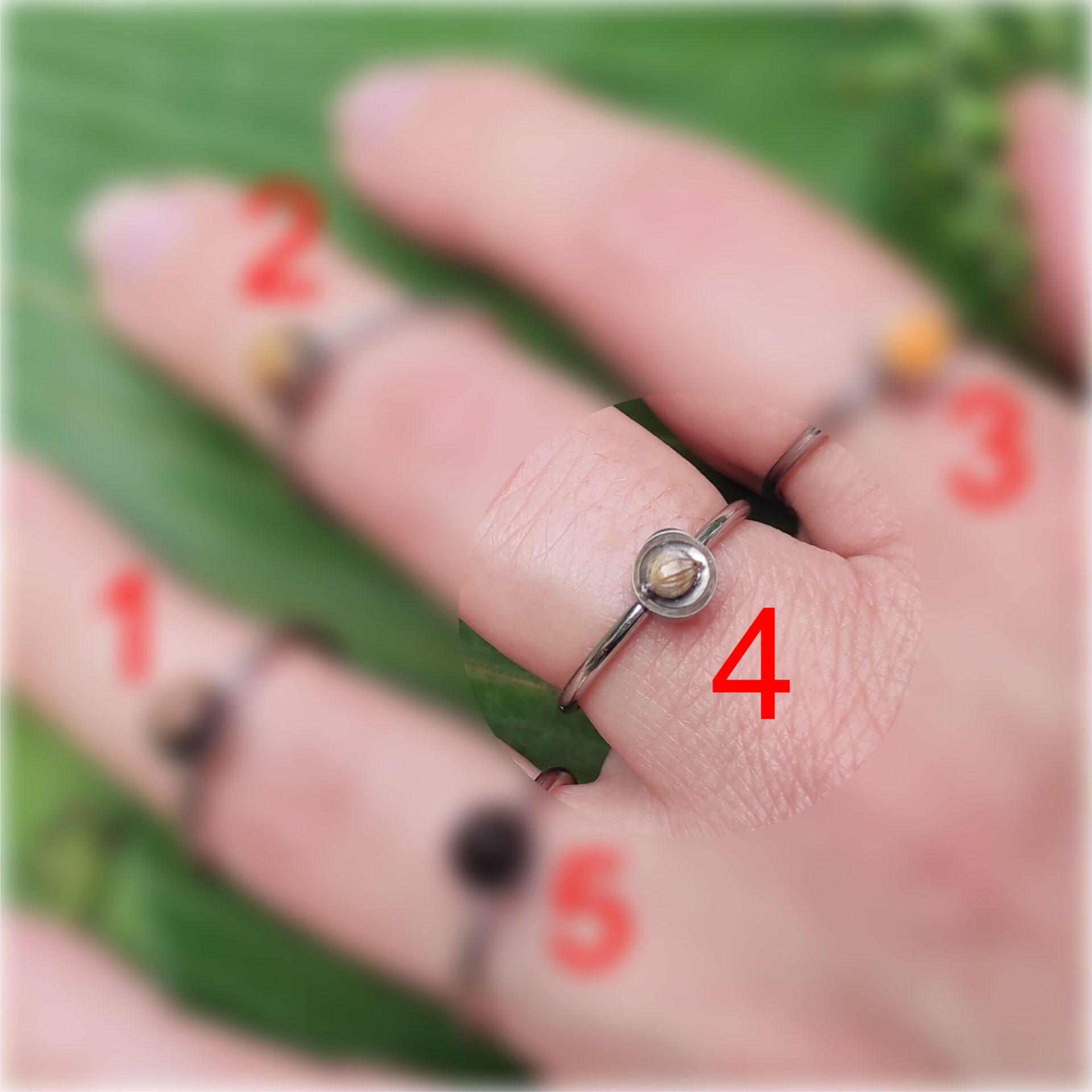- Ročno izdelan prstan: Izdelan je iz vzdržljivega nerjavečega jekla in transparentne UV epoksi smole. V vsakem prstanu je ujeto eno seme, ki nosi svoj edinstven pomen: