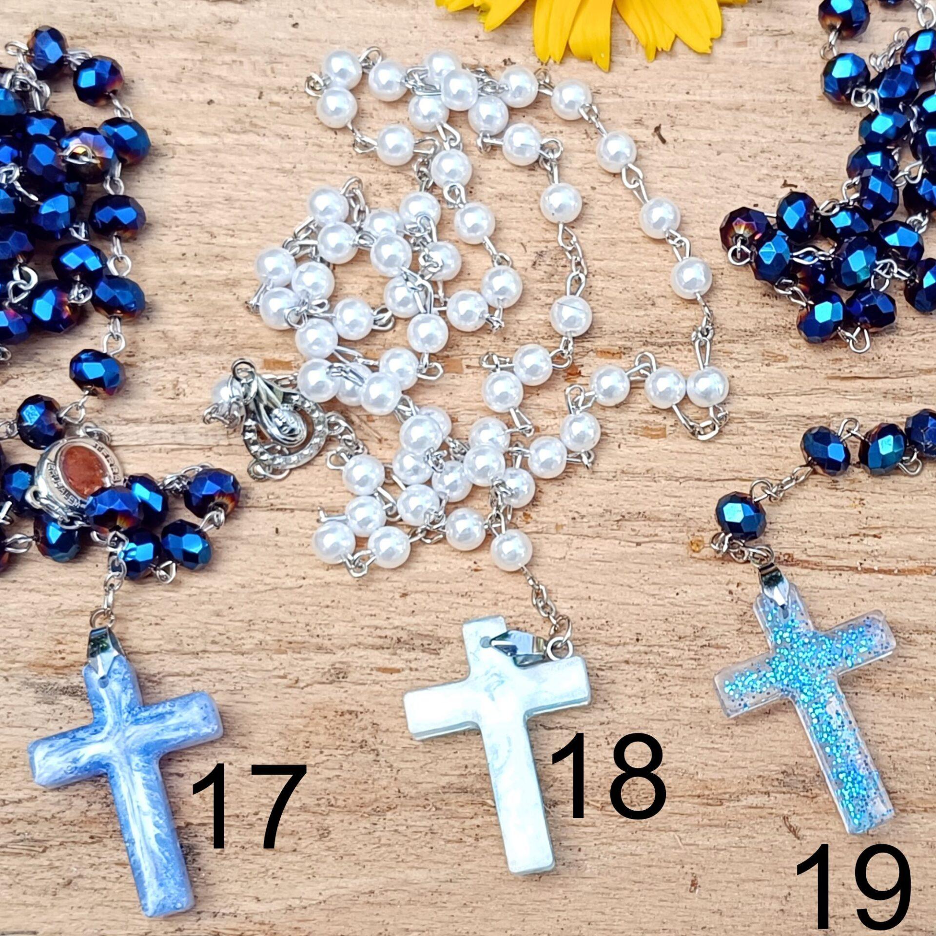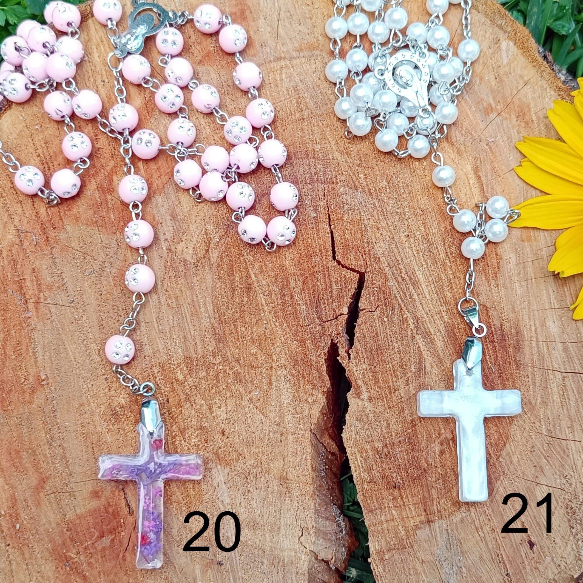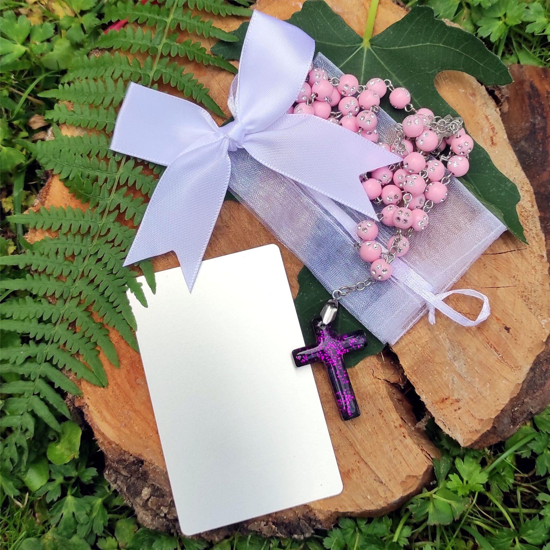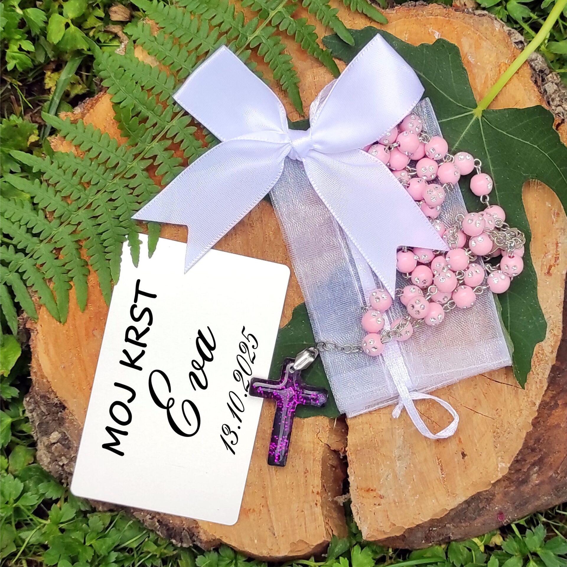 - Rožni venec z unikatnim križem: Osrednji element je rožni venec, ki se zaključi z ročno izdelanim križem iz UV epoksi smole.