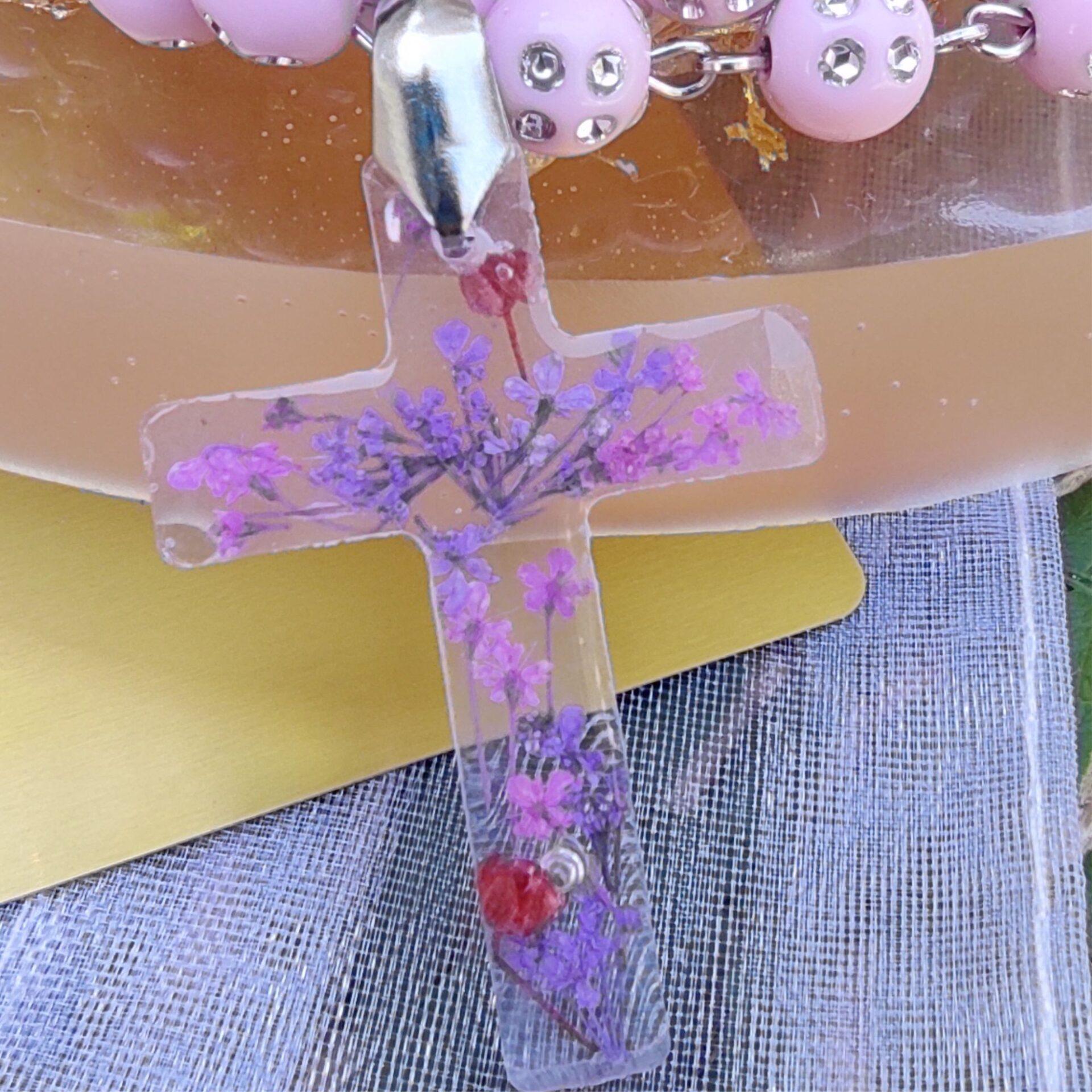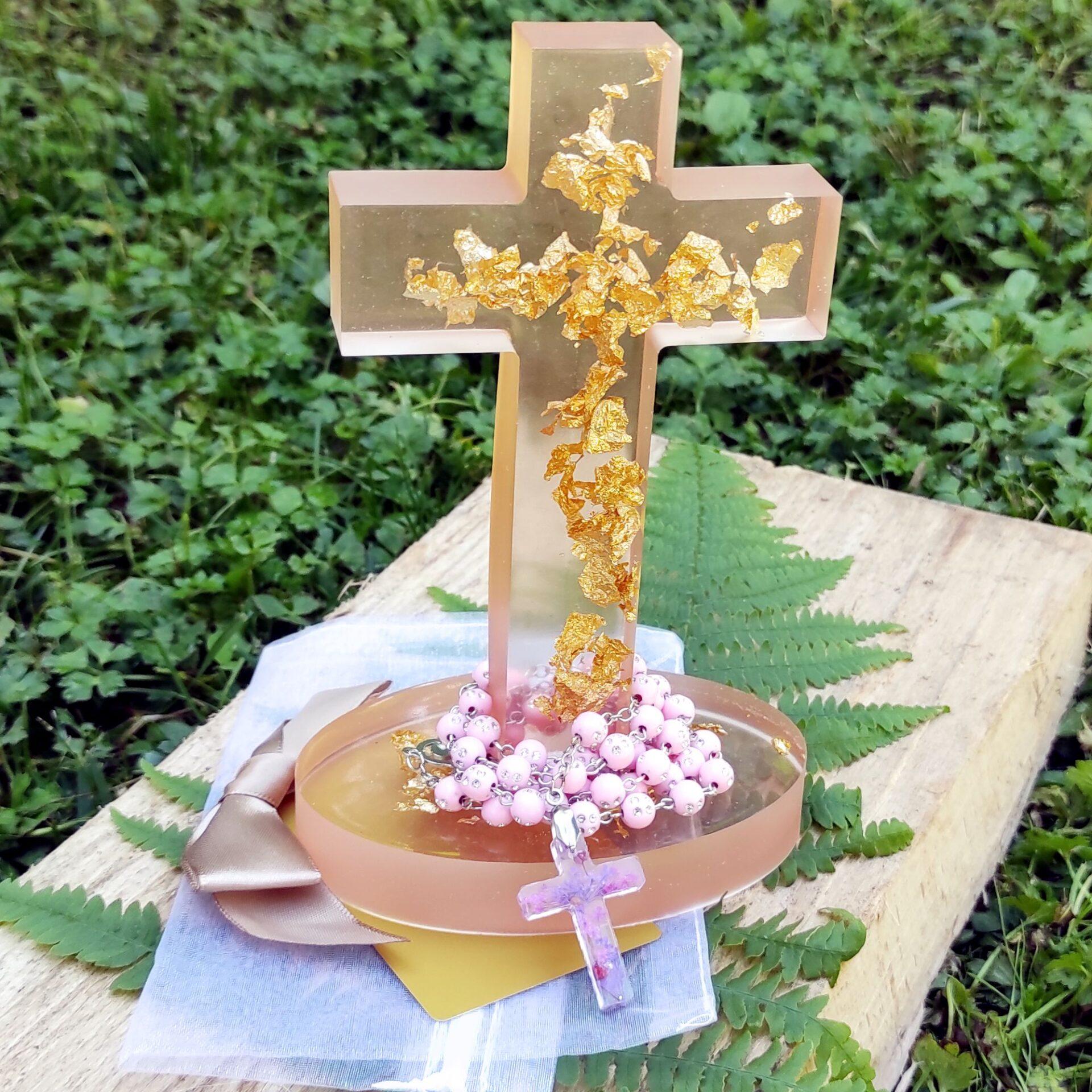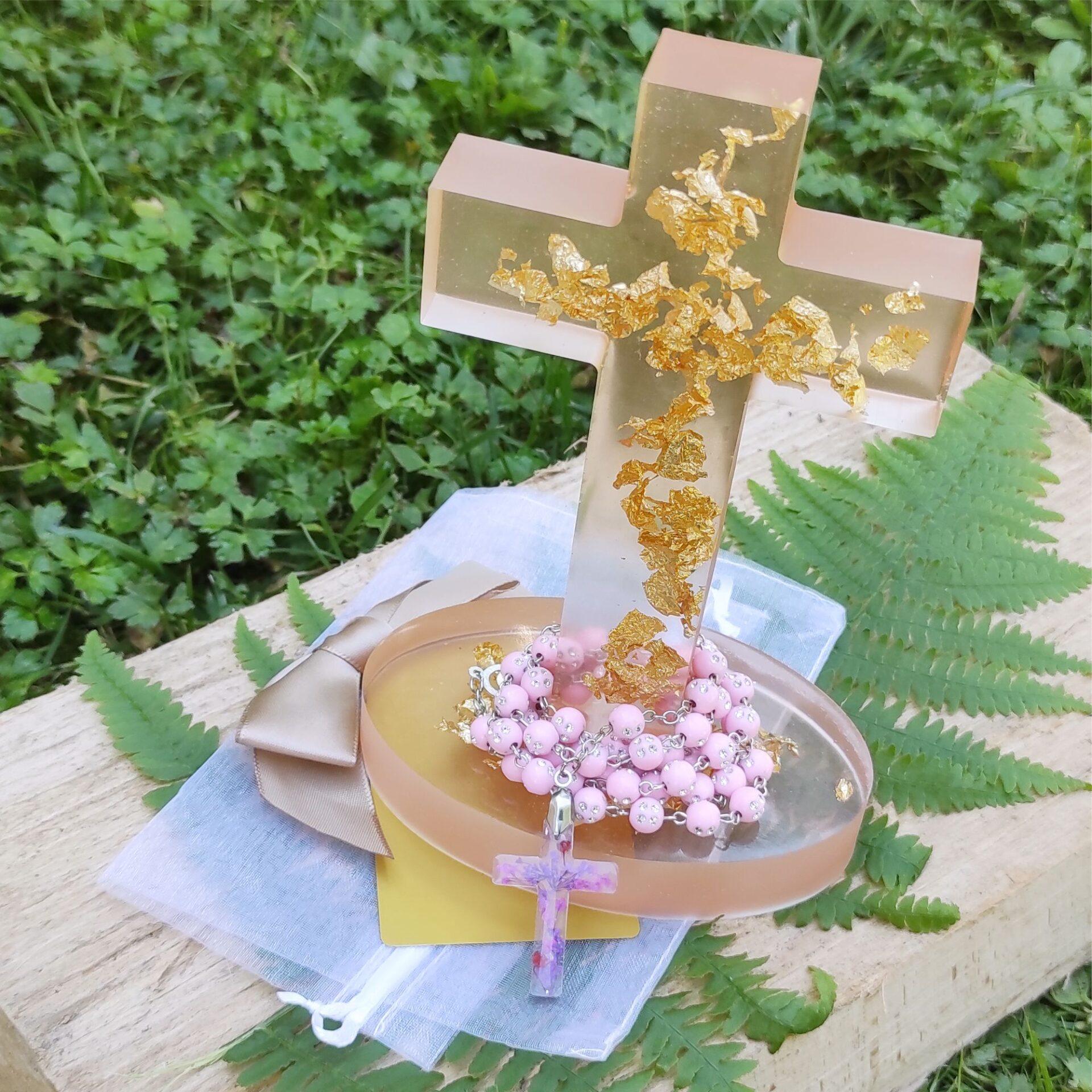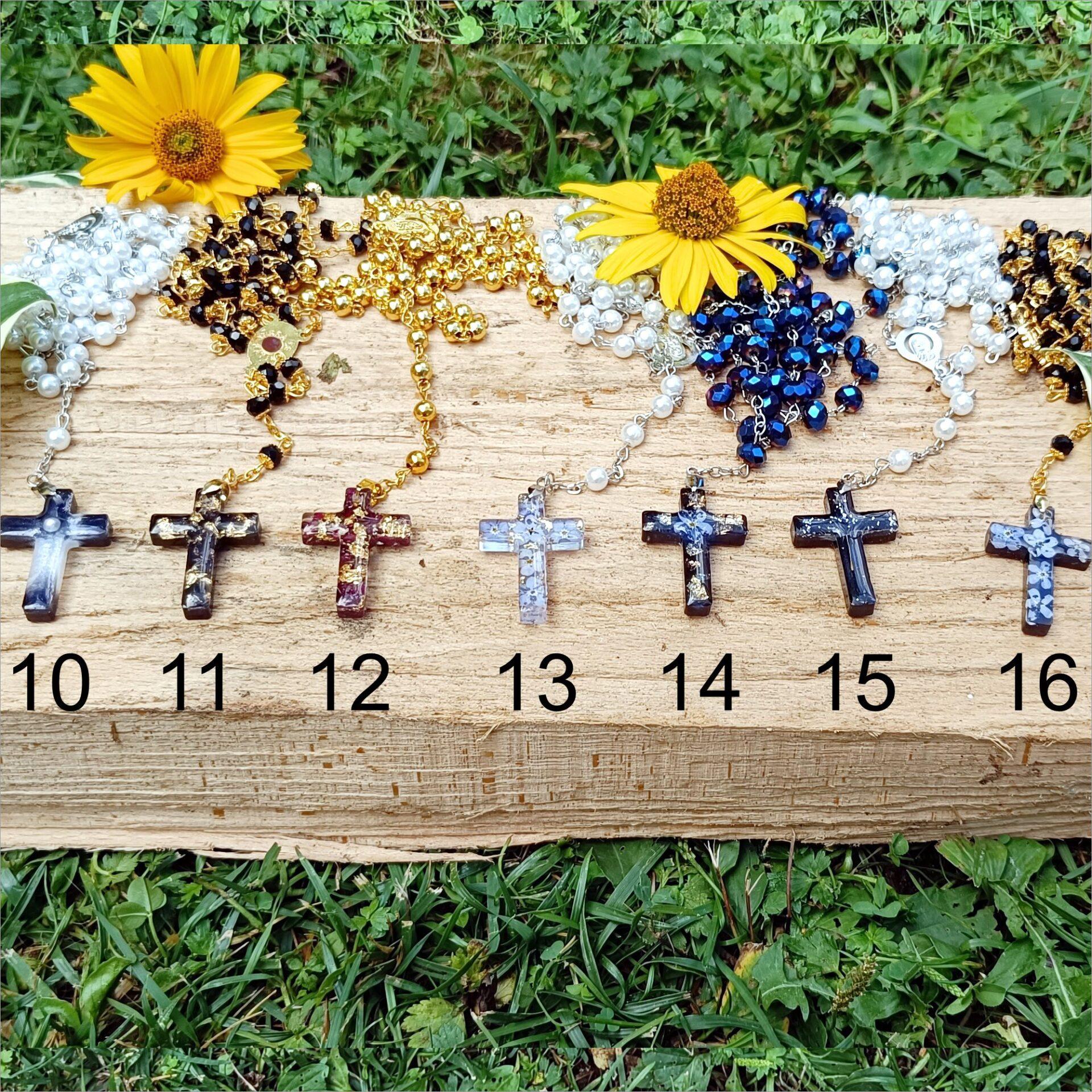 - Ročno izdelan križ: Rožni venec se zaključi z ročno izdelanim križem iz UV epoksi smole. Ta križ zahteva izjemno natančnost, zlasti pri vlitju pravih rož, bleščic ali zlatih/srebrnih delčkov. Izberete lahko model križa, ki vam je najbolj všeč.