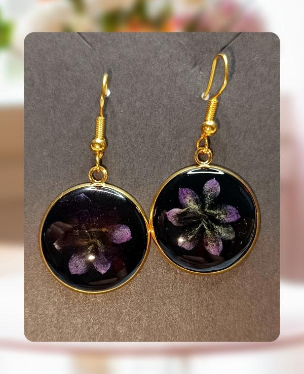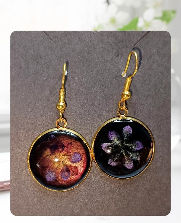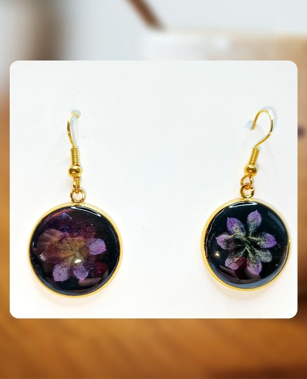 Uhani “Temna cvetlica” – Ročno izdelani pozlačeni jekleni uhani z UV smolo